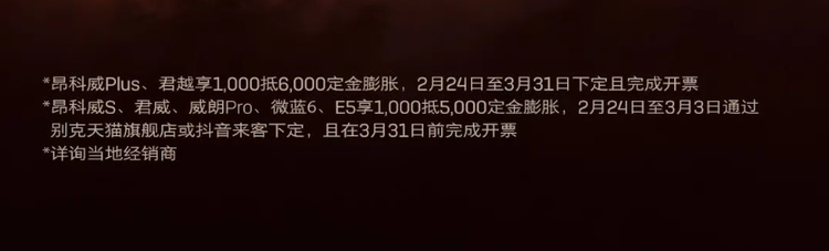 先给大家把政策捋明白,别到时候错过时间节点拍大腿。第一波是核心走量的两款重磅车型:君越和 昂科威Plus(参数|询价)。即日起到3月31日,只要在这个时间段下定并且完成开票,就能享受1000元抵6000元的订金膨胀,算下来君越限时优惠价直接干到15.49万起,昂科威Plus也只要16.49万起。这个周期给得比较宽,给足了大家看车、比价、纠结的时间。第二波是昂科威S、君威、威朗Pro、微蓝6还有纯电车型别克E5,这几款的政策是1000元抵5000元订金膨胀,但下定窗口期特别短,只到3月3日,还得通过别克其它线上渠道下定,只要3月31日前完成开票就能享受。划重点,这几款要下手的话,就得抓紧这几天,别等窗口期过了再后悔。