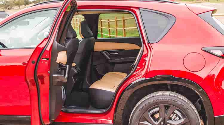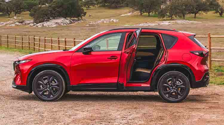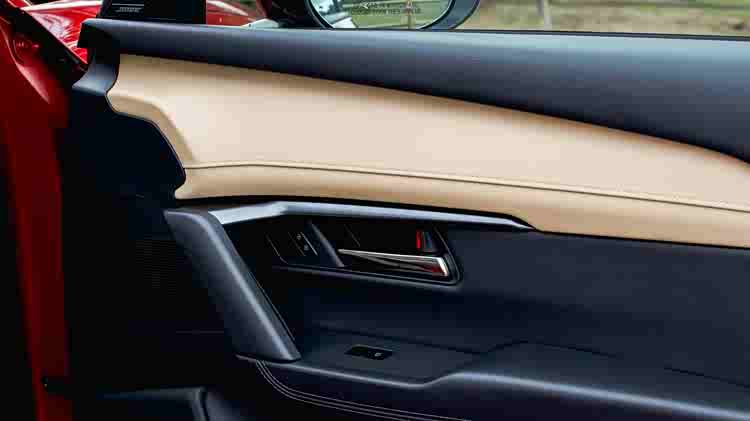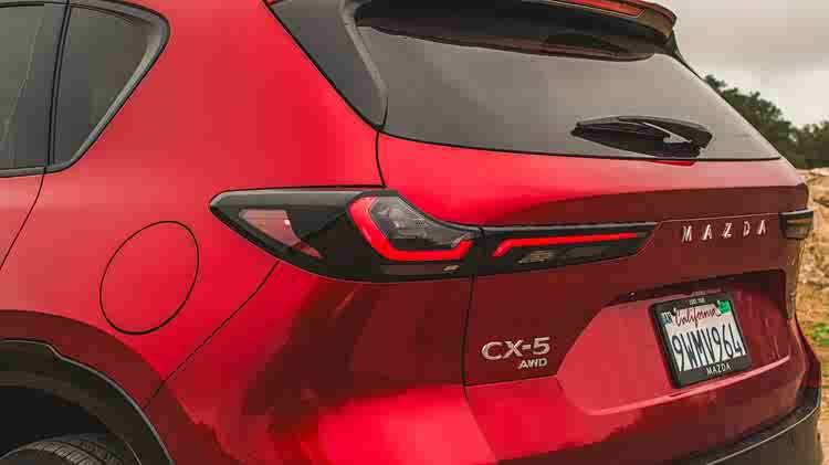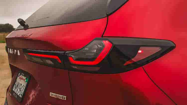 车身侧面,该车则延续了CX-60等车型的家族风格,又和CX-5结合,特殊的三角形粗壮D柱是最醒目的元素,大尺寸黑色轮毂,侧裙处的黑色装饰条和黑色后视镜形成对应,还有黑色行李架,配合魂动红车漆,保证了运动的氛围,略微加长了车身,也稍许提升了空间的表现。在车尾部分,尾灯则是鲜明的家族风格,弯折的造型和车头形成对应,大部分都是黑色灯腔和底面,但有两段弯折式的红色灯带插入其中,显示出不错的辨识度,车顶扰流板不会缺席,尾箱线条明显突出,增强了运动感。