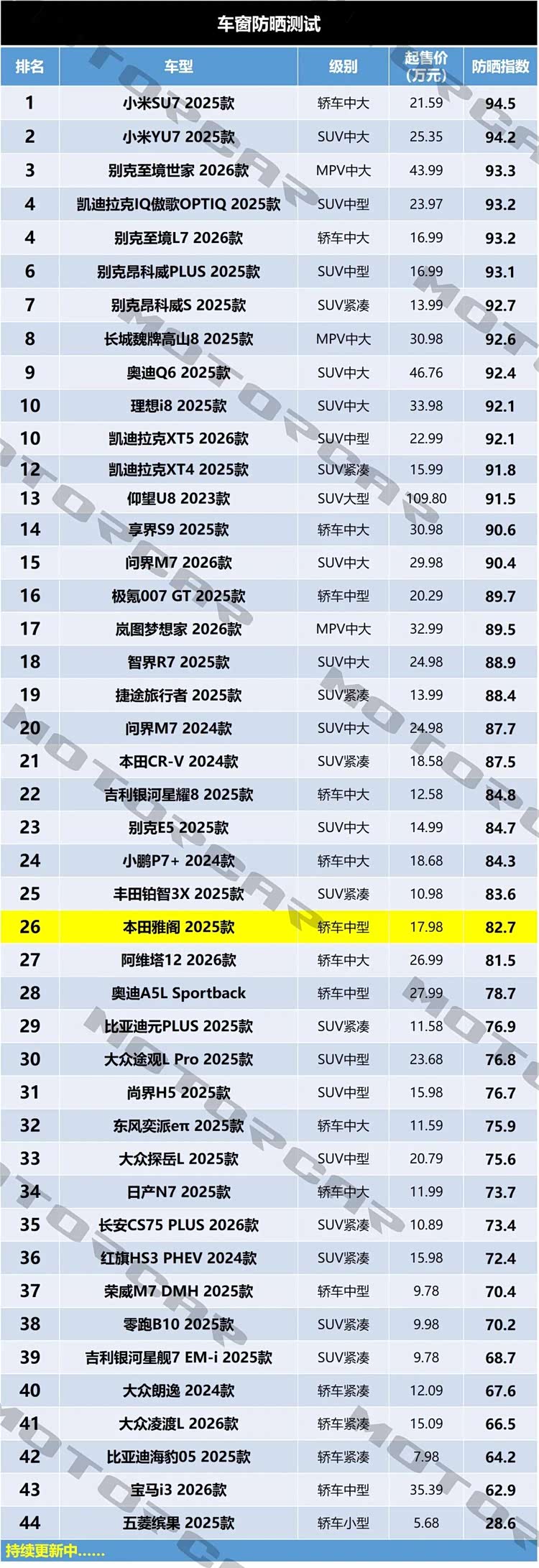 按照测试模型计算下来,本田雅阁 2025全车防晒指数为82.7分,在目前的测试排名中暂时排名第26,在市面上属于中游水准。