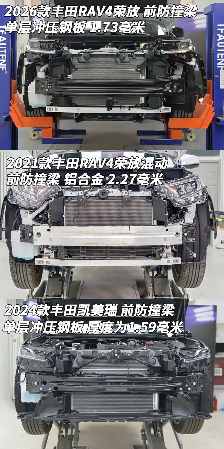拆掉前保险杠,能看到一根单层冲压钢板前防撞梁,厚度为1.73毫米,能覆盖车头的79.23%。不过,老款RAV4的前防撞梁是铝合金材质,明显降本增效了,这辆车倒是和凯美瑞的防撞梁比较相似。