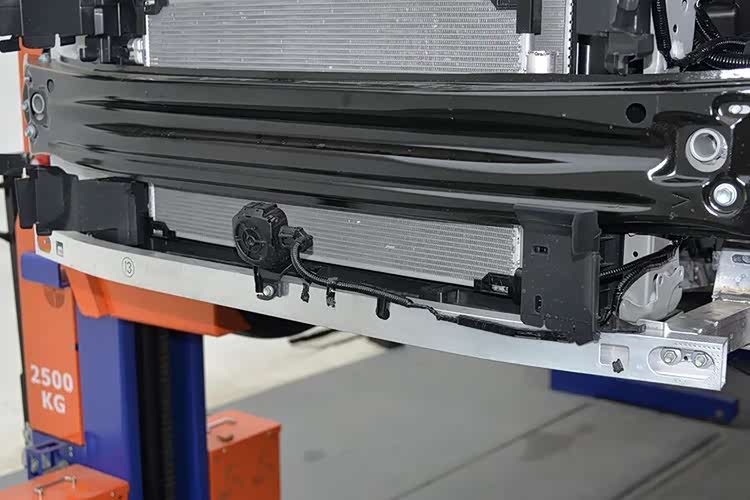 这辆车的副防撞梁与老款一样,都是口字形截面的铝合金梁,并且配备了带有溃缩褶皱的吸能盒。