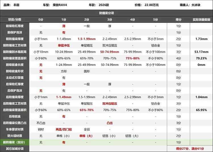那么关于这辆第六代荣放RAV4的底盘情况如何?有什么令人“惊喜”的地方呢?还请继续关注后续的拆车内容!(本文及视频中的测量数据结论观点仅对此辆车负责,测量数据对公示的实验方法负责。)