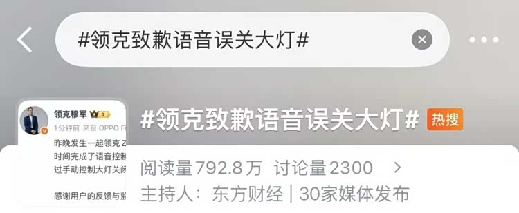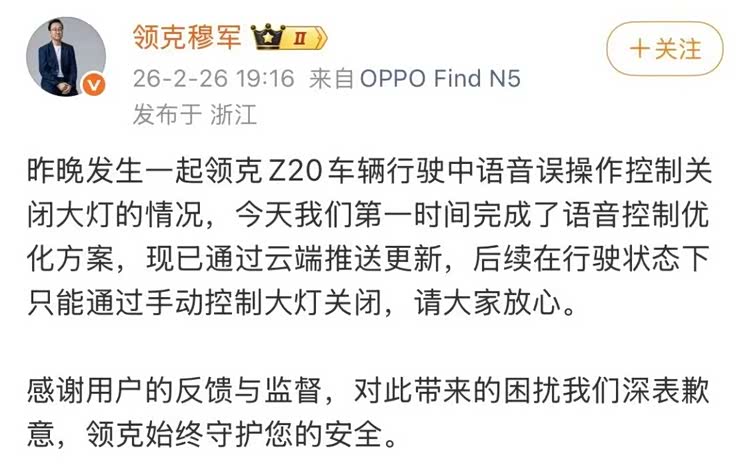 2026年2月25日凌晨,领克Z20车主在无路灯的高速公路上,发出“关闭阅读灯”的语音指令,搭载的LYNK Flyme Auto车机却出现严重识别错误,误将指令判定为“关闭全车灯光”。