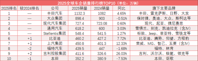 但2025年上汽表现十分亮眼,销量同比增长12.33%,增速在全球十大车企中仅次于吉利,位居行业第二。