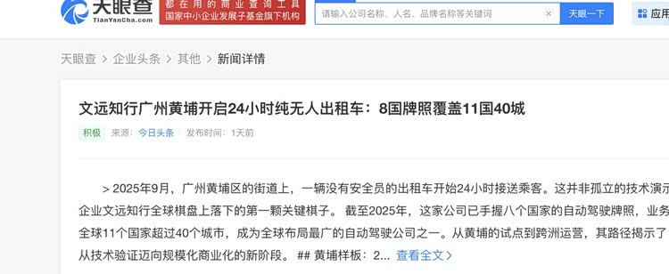 全球其他地方也在观望。中国倒是动作快,根据天眼查App显示,百度萝卜快跑、文远等早已经跑出了国外运营。