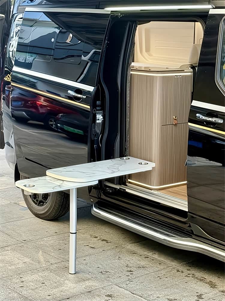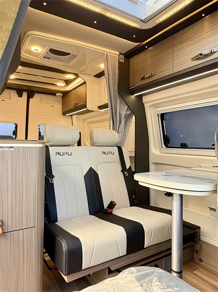 厨房、空调、水电等生活系统一应俱全,让移动居所更具“家”的质感。厨房系统配备102L双开门房车专用冰箱、镶嵌式电磁炉、微波炉、房车带盖专用水槽,翻折式扩展台面让操作空间更充裕,轻松烹制旅途美味;空调通风系统搭载驾驶舱原车行车大功率冷暖空调、48V壁挂式空调、燃油暖风热水一体机,行车、驻车皆能保持恒温,冬季取暖与日常热水需求一键满足,卫生间双向换气扇则让车内空气始终清新。