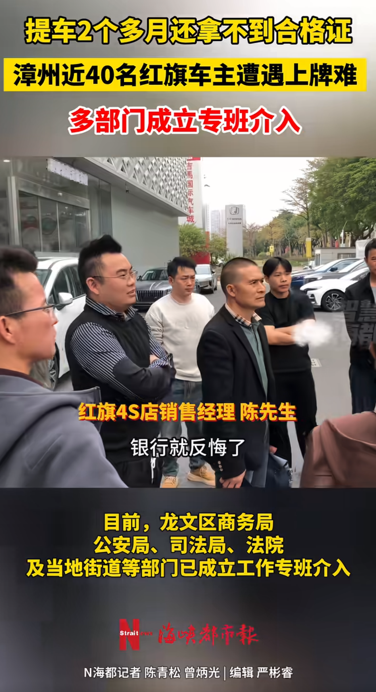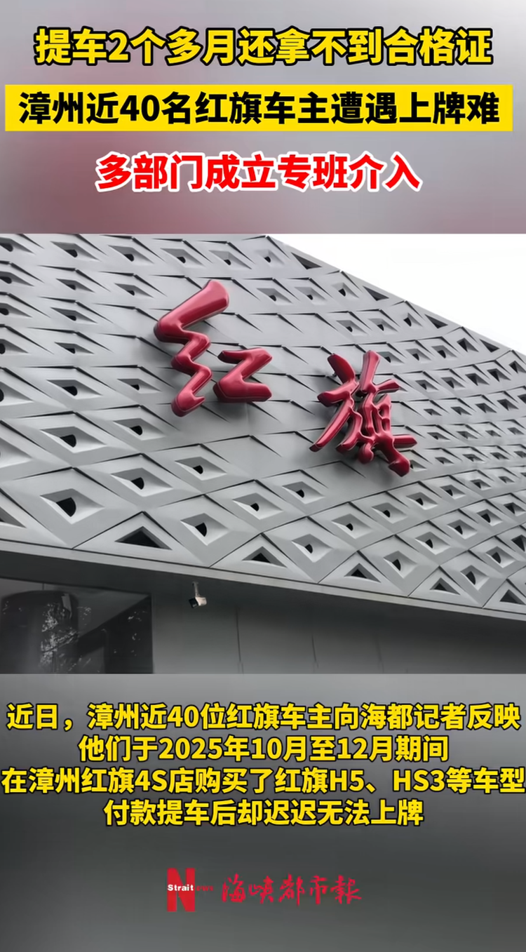 花数十万元购入心仪的新车,本是一件开启新生活的喜事。但对于漳州的40多位红旗车主而言,这份喜悦却变成了煎熬——2025年第四季度提车至今,临时牌照换了一张又一张,车辆却始终无法办理正式上牌手续。据悉当地多部门已紧急介入,试图为车主们化解困境。