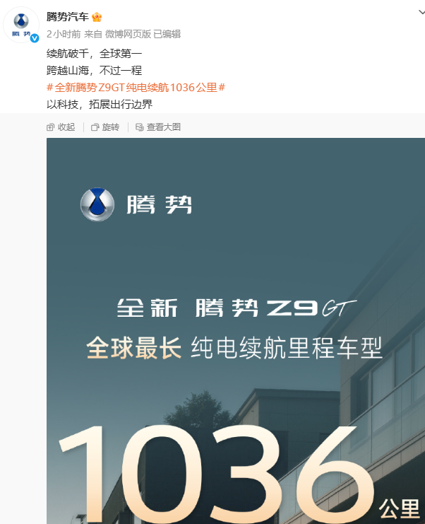 车家号·0浏览·2026-02-27 14:25 · 北京PChome 2月27日消息,比亚迪旗下高端品牌腾势正式官宣,全新 腾势Z9GT(参数|询价)纯电版CLTC工况续航最高达1036公里,为全球最长纯电续航里程车型,刷新行业纪录。