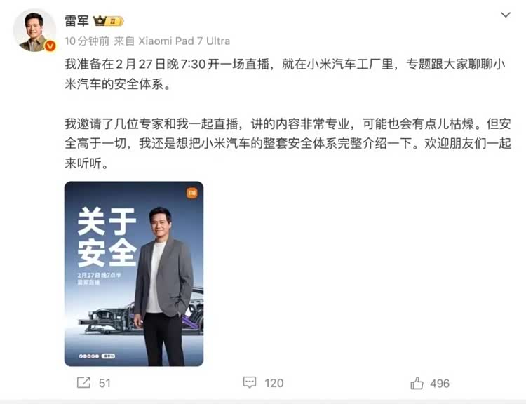 而今晚七点半,雷军要做一场“关于安全”的直播,聊聊小米汽车的安全体系。