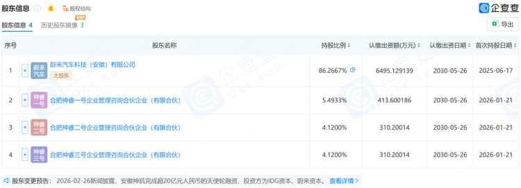 根据企查查上的信息,蔚来汽车科技(安徽)有限公司目前为神玑公司的大股东,持股比例86.2667%。