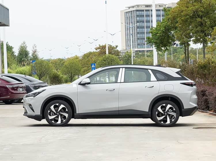 再来看车身侧面部分,车身尺寸保持中型SUV标准,长宽高分别为4760mm/1936mm/1650mm,轴距达2845mm,宽裕的轴距为车内空间奠定坚实基础,同时车身比例协调,避免了大尺寸的笨重感。并且车身侧面线条流畅,采用溜背造型设计,兼顾SUV的通过性与轿跑的动感,悬浮式车顶搭配隐藏式门把手,不仅提升科技感,更有效降低风阻系数,助力续航提升。新车配备18英寸多辐式低风阻铝合金轮毂,搭配235/50 R18轮胎,既保证行驶稳定性,又能兼顾胎噪控制,贴合家用定位。