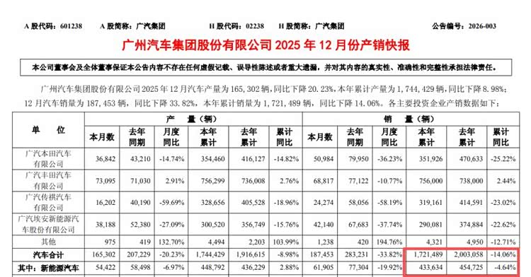 从多项成果来看,广汽集团在2025年确实交出了一份可观的成绩单,但在亮眼表现之下,仍存在不容忽视的隐忧。尽管终端销量突破180万辆,但据广汽集团2026年1月发布的产销数据,2025年集团批发销量为172.15万辆,与终端销量之间存在明显差距。