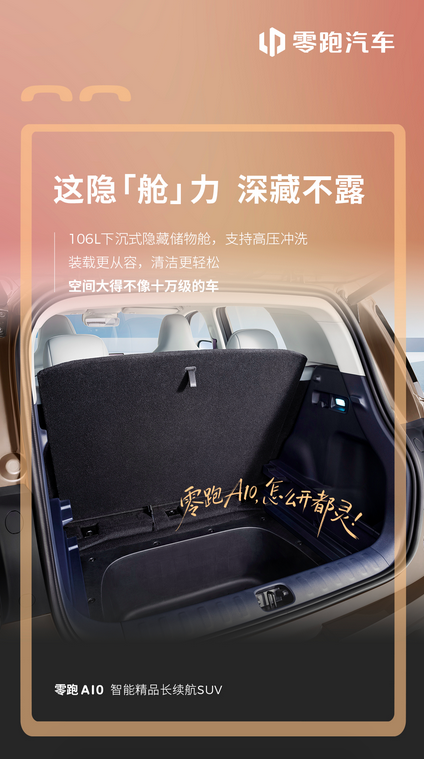 零跑A10直接给你一个带排水口的“洗物池”。这种场景化的设计,绝对不是坐在办公室里拍脑袋想出来的,这绝对是产品经理深入用户生活挖出来的痛点。