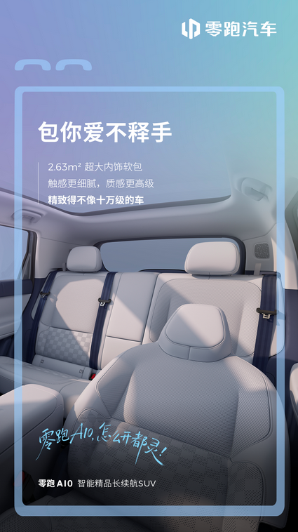 其次是触觉上的“软刀子”。零跑这次很鸡贼地公布了一个数据:2.63平方米的超大内饰软包。这个数据太有杀伤力了。十万级的车,为了抠成本,通常都是“能省则省”,手肘能碰到的地方是软的就算良心了,但零跑A10几乎把你能接触到的地方全包了。
