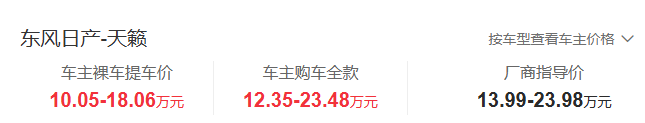 首先是价格,26款日产新天籁的厂家指导价为13.99-23.98万元,在终端已经有着1万元的现金优惠幅度。而且我们发现叠加上补贴,不少用户购买到的裸车价甚至连11万都不到,所以说这是一款价格亲民的中级燃油车。