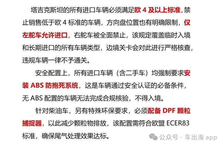 首先在车型准入方面,塔吉克斯坦有着明确的环保与安全标准,既贴合国际规范,又兼顾本土使用需求。根据当地TajikAutoCert认证体系要求,进口车辆必须是左舵车,右舵车严禁进口,这与我国车辆标准高度契合,从源头降低了出口适配成本。环保方面,车辆需满足欧4及以上排放标准,其中柴油车必须配备DPF颗粒捕捉器,有效控制尾气污染;安全配置上,ABS防抱死制动系统为强制要求,2018年后出厂的车辆还需新增FCW前方碰撞预警系统,进一步提升行车安全门槛,而我国多数在售及二手车辆均能满足这些要求,适配性极强。