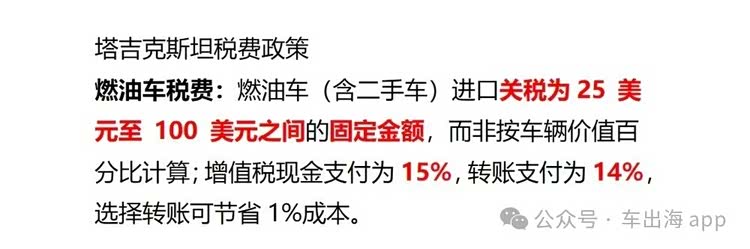 税费政策是塔吉克斯坦进口车政策的最大亮点,燃油车与新能源车实行差异化对待,其中新能源车的优惠力度尤为突出。燃油车关税采用固定金额收取,而非常见的百分比计税方式,税额区间为25美元至100美元,具体根据车辆排量、车型略有调整,整体税费成本可控;增值税则分两种支付方式,现金支付为15%,转账支付可降至14%,看似微小的差异,批量出口时能节省一笔可观的成本,建议出口商优先选择转账支付方式。