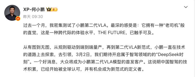 同一天,小鹏汽车董事长何小鹏也对外透露,大众汽车集团将成为小鹏第二代VLA模型的首发客户。他在发文中表示:“这说明中国智驾的技术积累,已经开始被全球认可。”