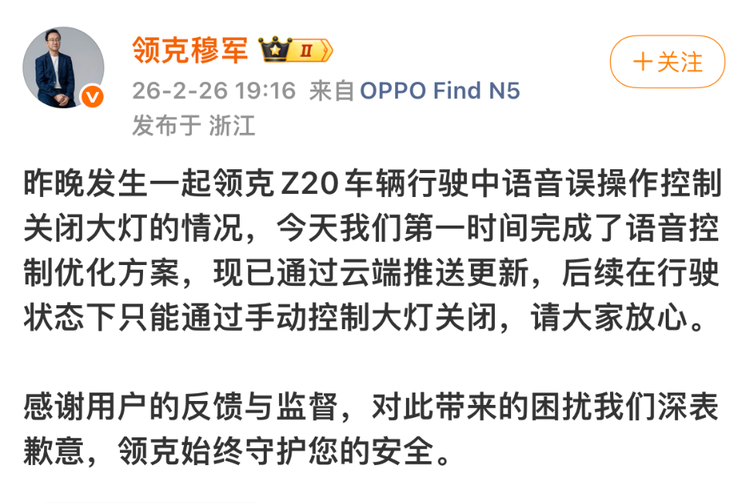 关于领克Z20因语音指令识别错误而引发事故,厂方的回应还算及时,态度也较为诚恳。2月26日,领克汽车销售有限公司副总经理穆军在其个人微博上公开回应:“今天我们第一时间完成了语音控制优化方案,现已通过云端推送更新,后续在行驶状态下只能通过手动控制大灯关闭,请大家放心。”