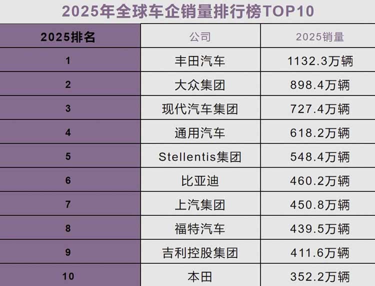 2025年全球车企销量榜,丰田稳坐第一,中国三强进前十