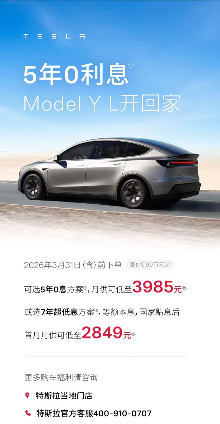 车家号·0浏览·2026-02-27 18:27 · 北京特斯拉中国 26 日宣布,3 月 31 日(含)前下单,可享受 7 年超低息贷款购车政策。其中,Model 3 首付 7.99 万元起,首月月供可低至 1759 元;Model Y 首付 7.99 万元起,首月月供可低至 2188 元; Model Y L(参数|询价) 首付 9.99 万元起,首月月供可低至 2849 元。上述三款车型同时提供 5 年 0 息贷款方案供消费者选择。