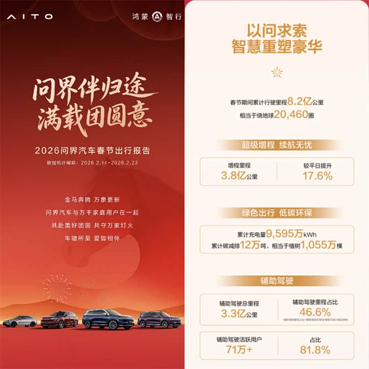 这个春节,问界用数亿公里的陪伴,温暖每一段奔赴团圆的归途;用7万余次主动守护,诠释了“安全是最大的豪华”;用春节不打烊的服务,让用户出行更省心、舒心和开心。智慧护航归途,爱意照亮前路,展望2026,问界汽车将携手每一位用户,持续探索智慧出行新体验,与万千家庭共赴美好新程。