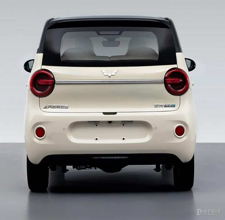车尾来看,整体的设计布局与前脸形成呼应,同样采用圆形尾灯组,并通过镀铬条相连。后保险杠的黑色饰板也与前脸相呼应。相比现款车型来看,第五代宏光MINIEV在多处细节加入圆形元素进行妆点,试图营造“可爱”形象,但可能有点“走偏了”。