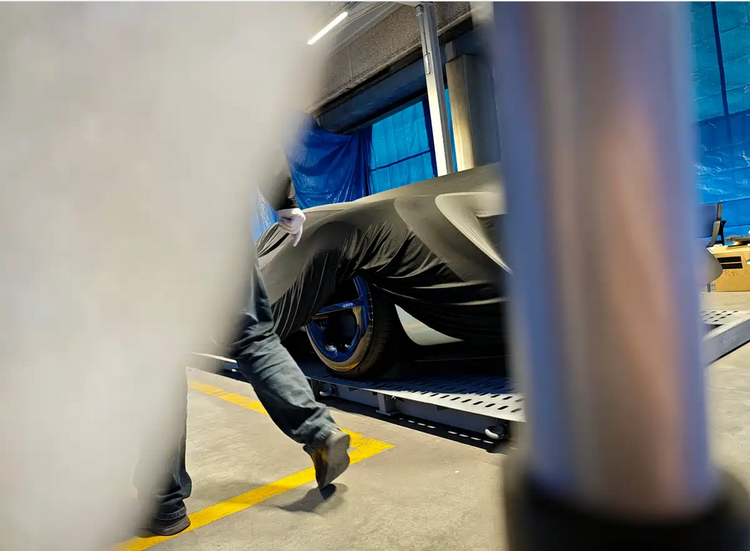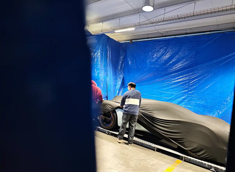从有限的谍照信息判断,新车采用低重心、宽轮距布局,整车呈现典型中置或后驱性能车比例。车头压低,前悬较短,驾驶舱位置靠后,尾部延展空间明显,为空气动力学结构预留体量。轮圈尺寸目测在20英寸以上,采用大开孔造型,便于制动系统散热。整车姿态更接近纯赛道取向的原型车,而非量产跑车比例。即便在车衣覆盖下,车体轮廓仍能看出前舱与后舱高度差明显,这类布局通常服务于下压力优化与气流引导。对于熟悉赛道车结构的用户而言,这种比例组合意味着车辆可能在前后轴荷分配与高速稳定性方面进行专门设计。