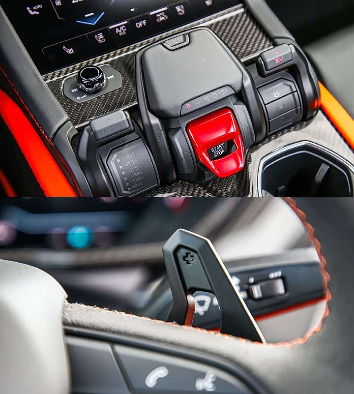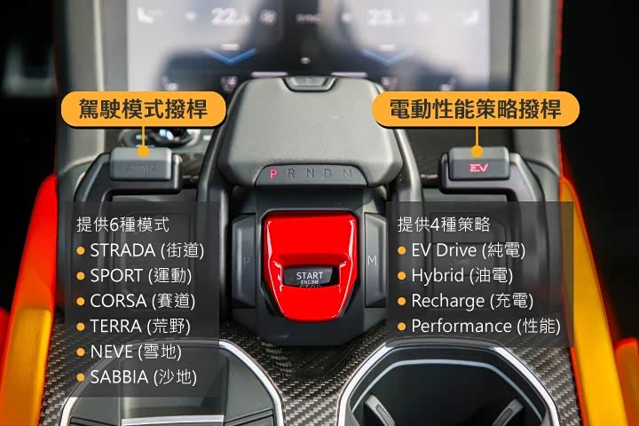 而也由于多了油电系统,所以 Urus SE 在排档鞍座右侧设置了电动性能策略 (Electric Performance Strategies、简称 EPS) 拨杆和按钮,提供 EV Drive (纯电)、Hybrid (油电)、Recharge (充电) 和 Performance (性能) 共 4 种模式,并可与 STRADA (街道)、SPORT (运动)、CORSA (赛道)、TERRA (荒野)、NEVE (雪地) 与 SABBIA (沙地) 共 6 种驾驶模式搭配,组合出共 11 种的选择,适应不同的道路环境。