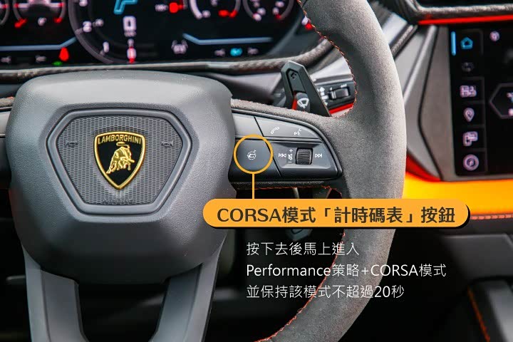 此外,兰博基尼还在 Urus SE 方向盘中央盘辐的右侧,设计了一颗饰有「计时码表」图样的按钮,驾驶人只要按下去,无论处在何种电动性能策略,车辆都会马上进入 Performance 策略的 CORSA 模式,提供完整的动力输出与驾控参数,并在仪表板上显示 20 秒的倒数时间提醒驾驶人,轻松摆脱无谓的骚扰与挑衅,感觉就象是闪电霹雳车「阿斯拉」开启二段推进模式、进入「零的领域」一般,过瘾极了!