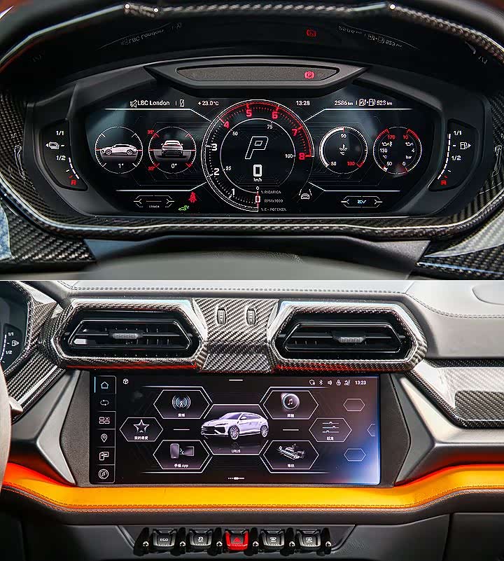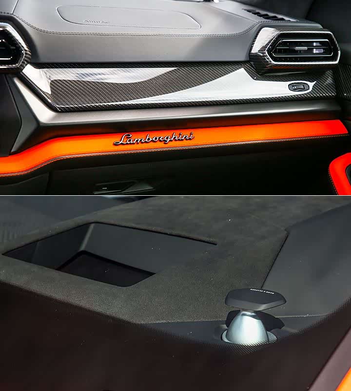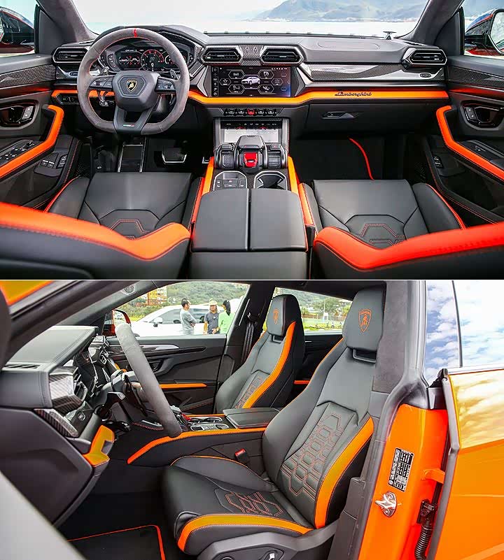 座舱内,Urus SE 则是维持品牌「战斗机座舱化」的空间设计,并搭载与 Revuelto 相同的 12.3 吋数位彩色仪表和 12.3 吋触控荧幕、按钮设计略有差异的三辐式多功能跑车方向盘 (麂皮包覆与 12 点红色指标为选配)、全新饰版与空调出风口,且导入新版 HMI (Human Machine Interface) 人机界面,并在前座装上两张新开发的 12 向电动可调跑车座椅。