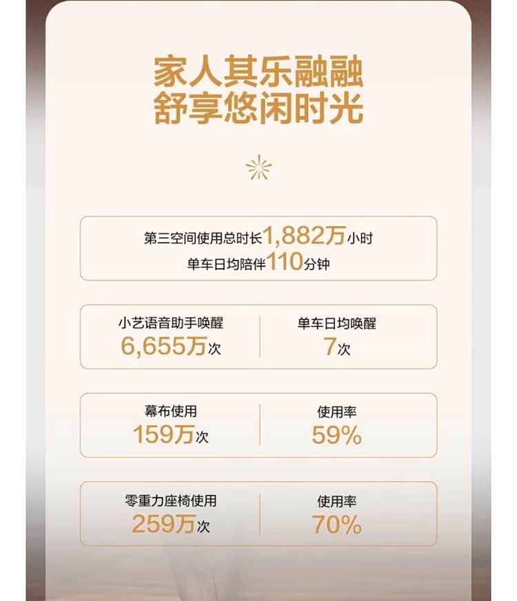 智能座舱化身温馨“第三空间”,用户累计使用时长1882万小时,单车日均陪伴110分钟。智能语音助手“小艺”被唤醒6655万次,零重力座椅使用率高达70%,科技让陪伴更有温度。