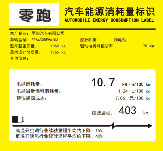 动力系统方面,零跑A10采用前置单电机设计,其中,低配版车型的最大功率、扭矩分别为70kW和150Nm;高配车型为90kW和150Nm。纯电续航里程方面,低功率车型的纯电续航里程为403km,高功率版为505km,单纯就续航里程而言,其要优于比亚迪元UP,后者的高配车型纯电续航里程仅为401km。考虑到消费者的实际需求,小猫认为纯电续航里程长将成为零跑A10的重要卖点。