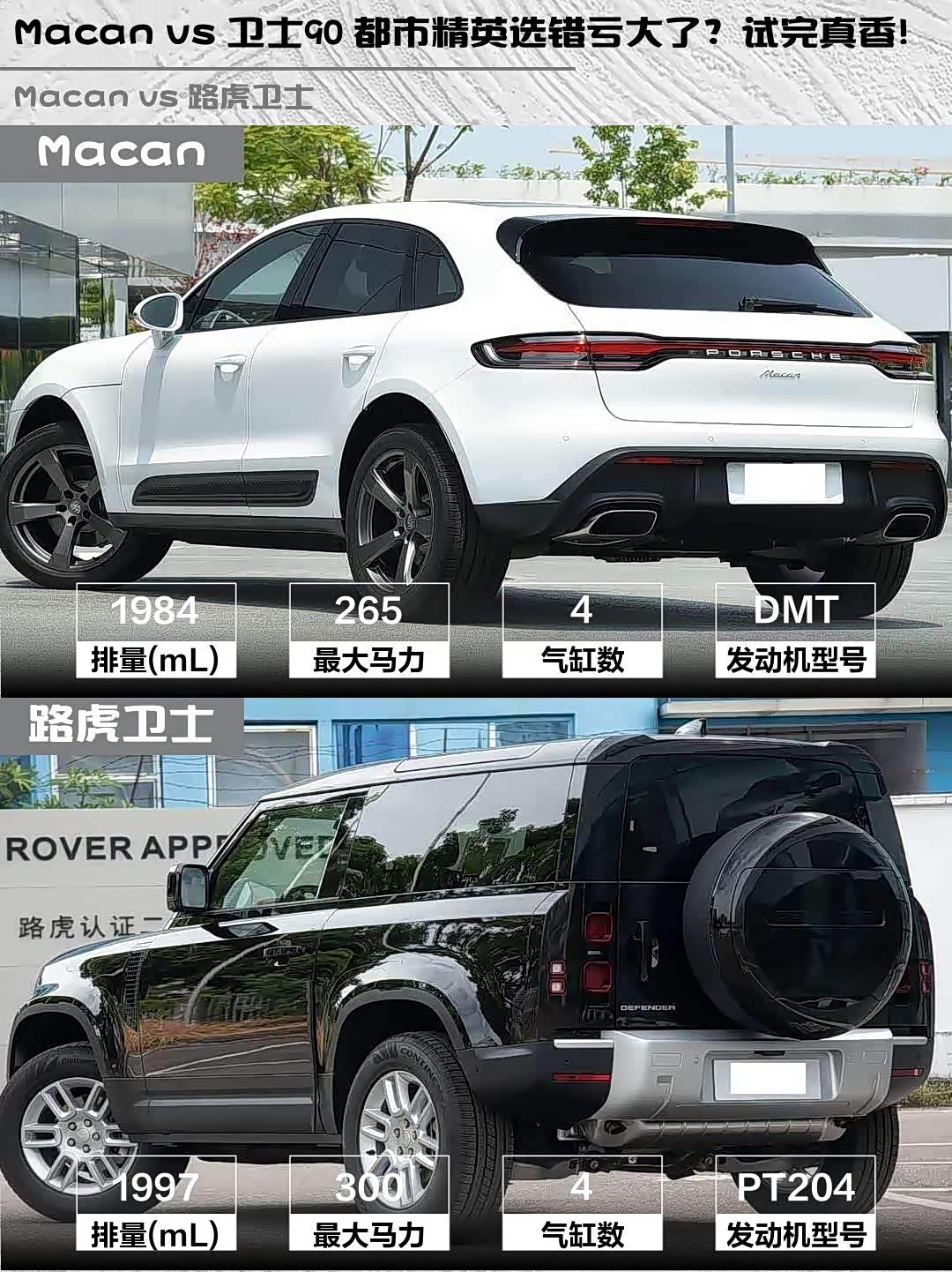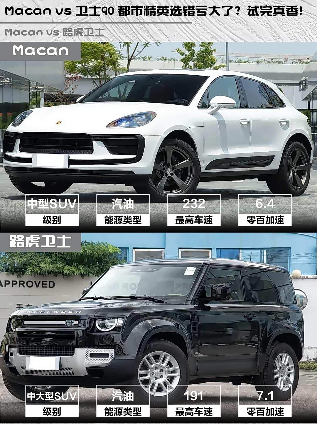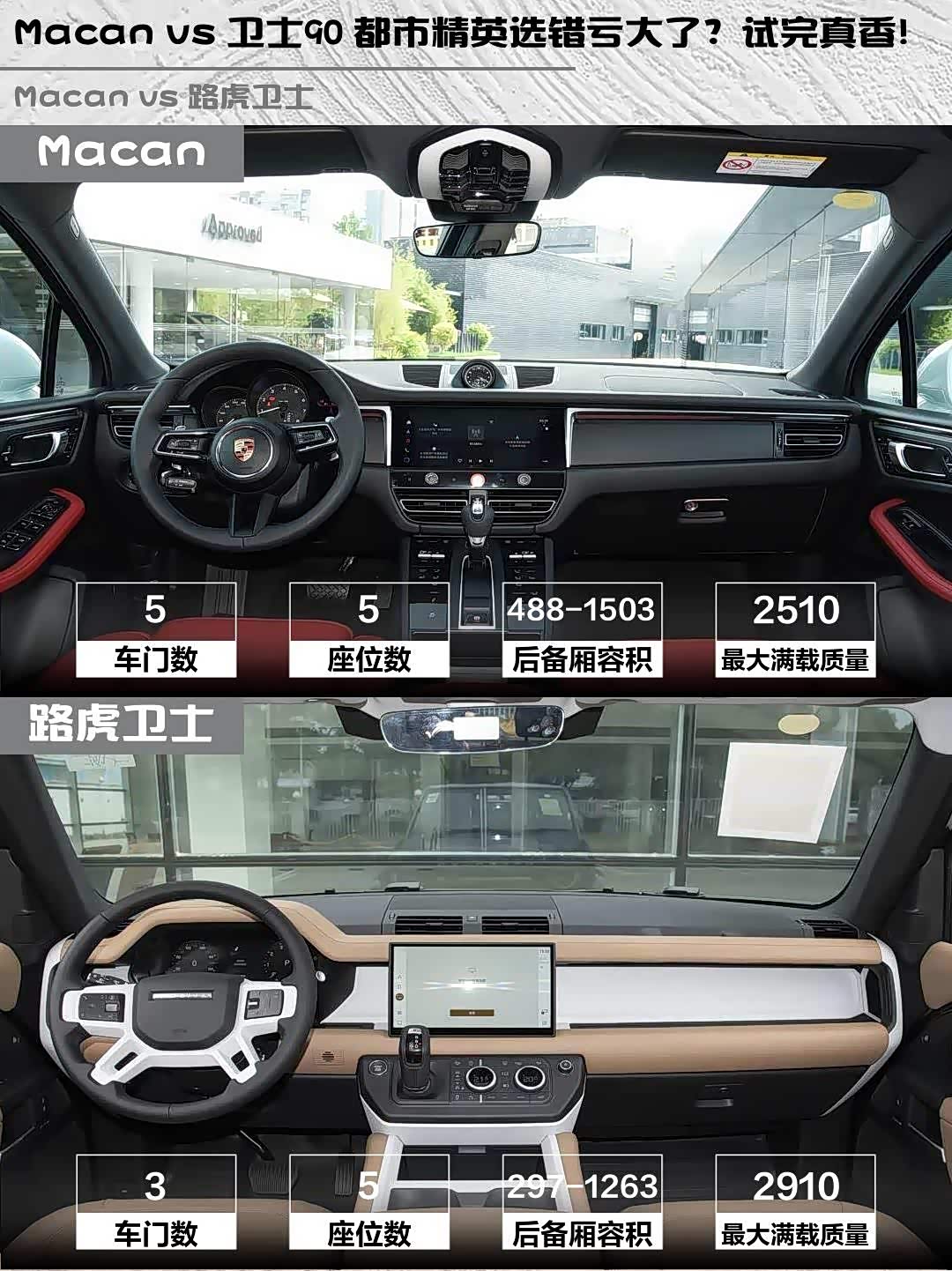 最后说句大实话:这俩车根本不是一个赛道的,纠结的话建议都试驾!Macan的声浪和卫士的涉水喉声效,试完就知道自己想要什么了🔥