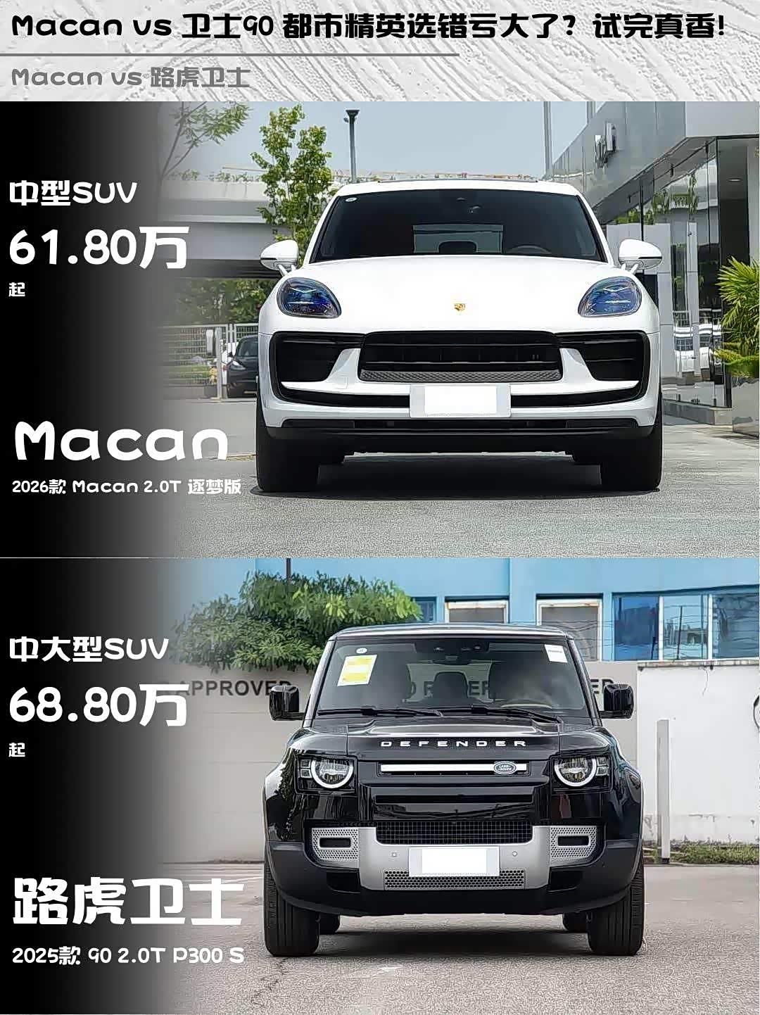 最近在纠结2026款 Macan 2.0T 逐梦版和2025款 路虎卫士(参数|询价)90 2.0T P300 S的朋友看过来!这两台车风格差异巨大,但价格区间重叠,到底怎么选?深度对比干货送上👇
