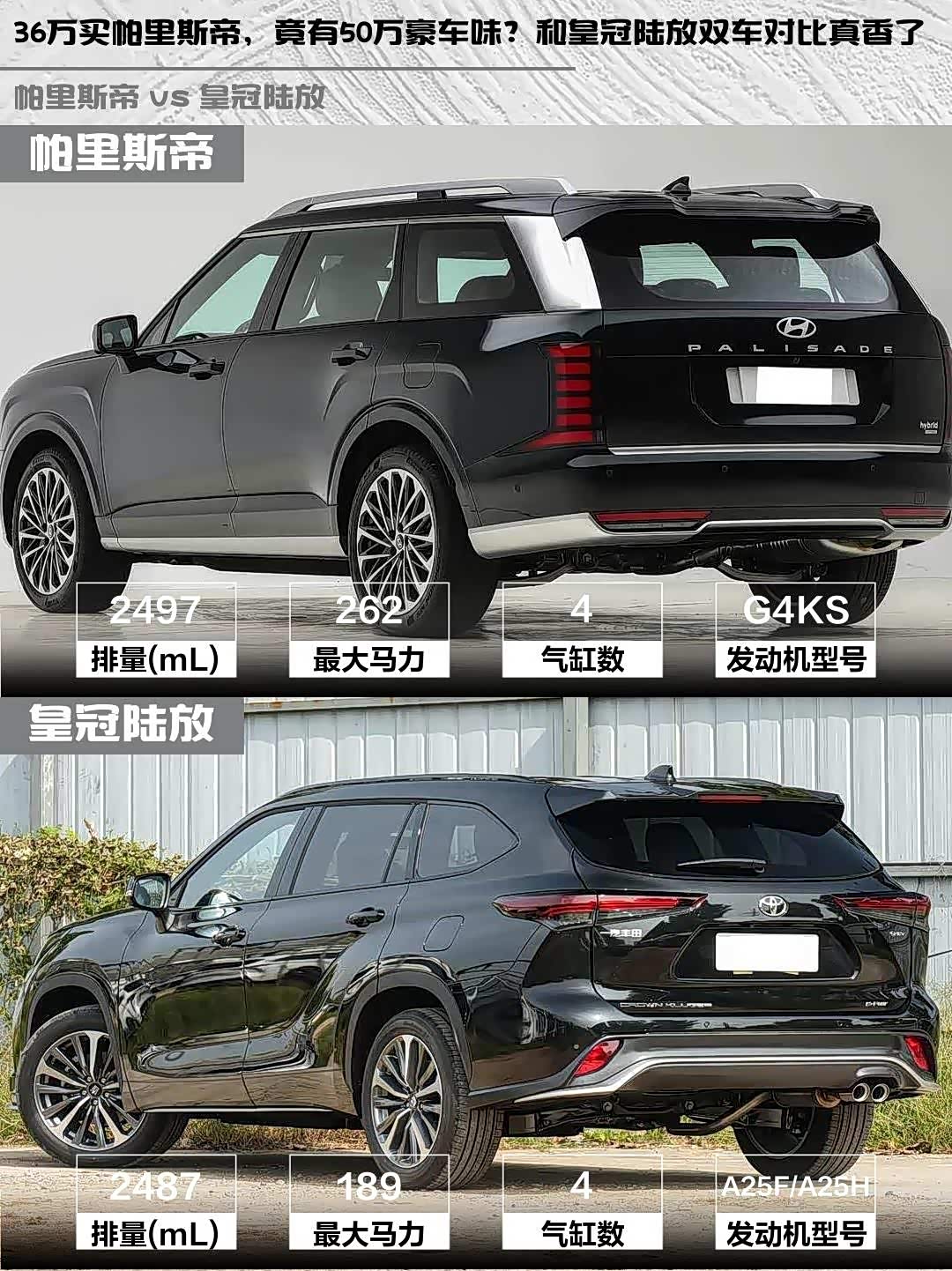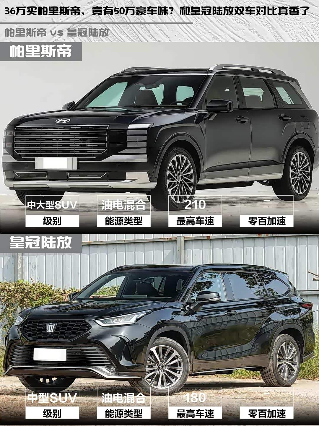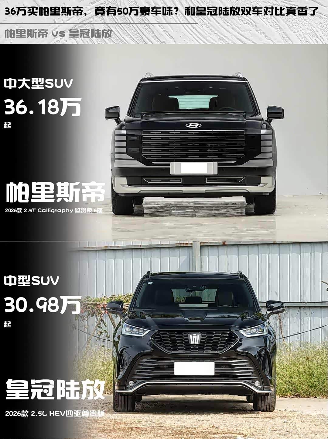 最近在选车的小伙伴看过来!今天深度对比两款热门中大型SUV—— 帕里斯帝(参数|询价) 2026款 2.5T Calligraphy 鉴赏家 6座和皇冠陆放 2026款 2.5L HEV四驱尊贵版,看完这篇你就知道哪款更适合你!🔥