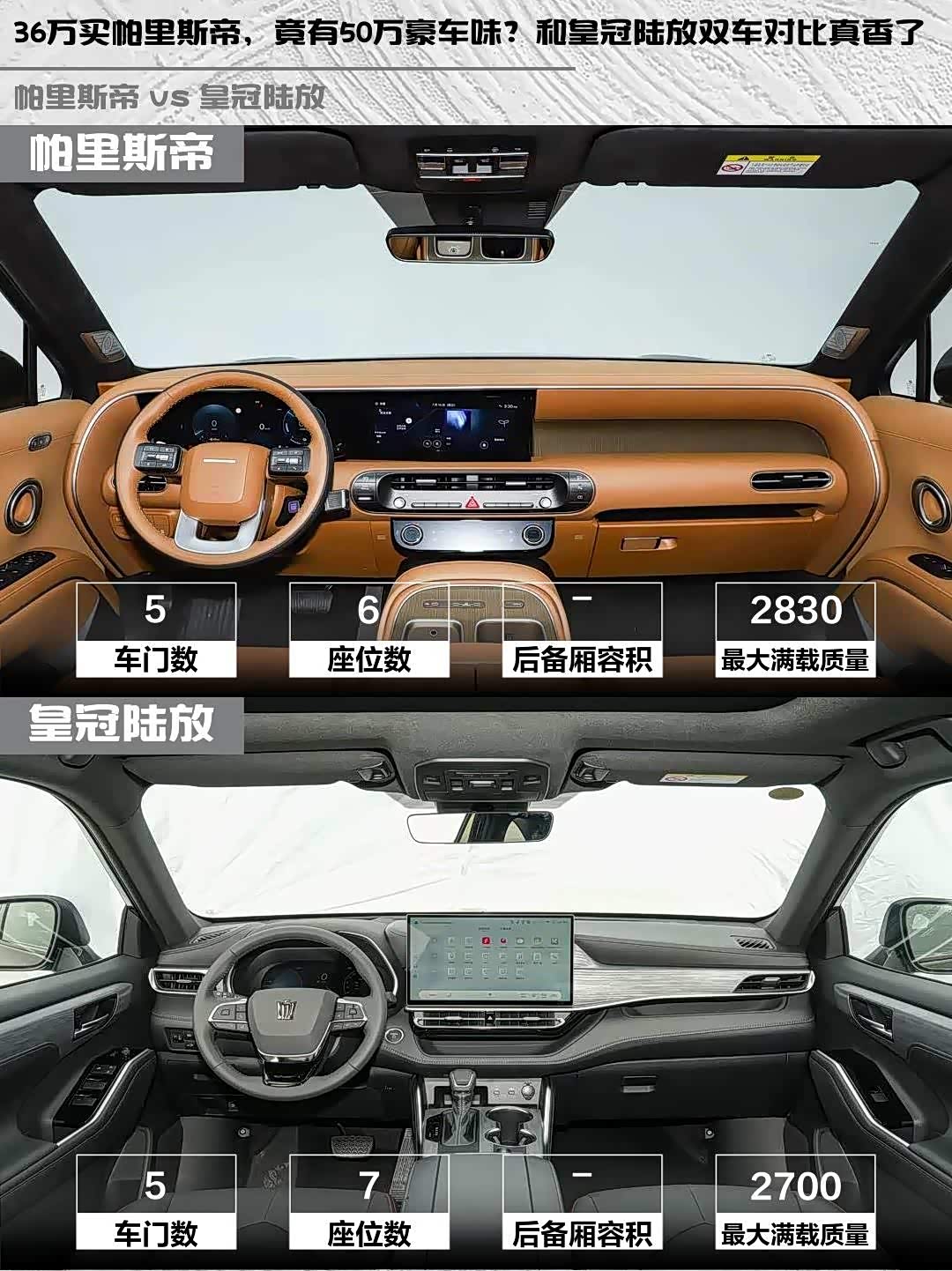 帕里斯帝的6座布局太香了!第二排独立座椅带通风/加热,2970mm轴距让第三排成年人坐也不憋屈。Nappa真皮+翻毛皮顶棚,质感直接拉满。皇冠陆放虽然是7座,但第三排更适合应急,内饰塑料感稍重。不过它的全景天窗比帕里斯帝的分段式更通透,后备箱灵活度也不错。