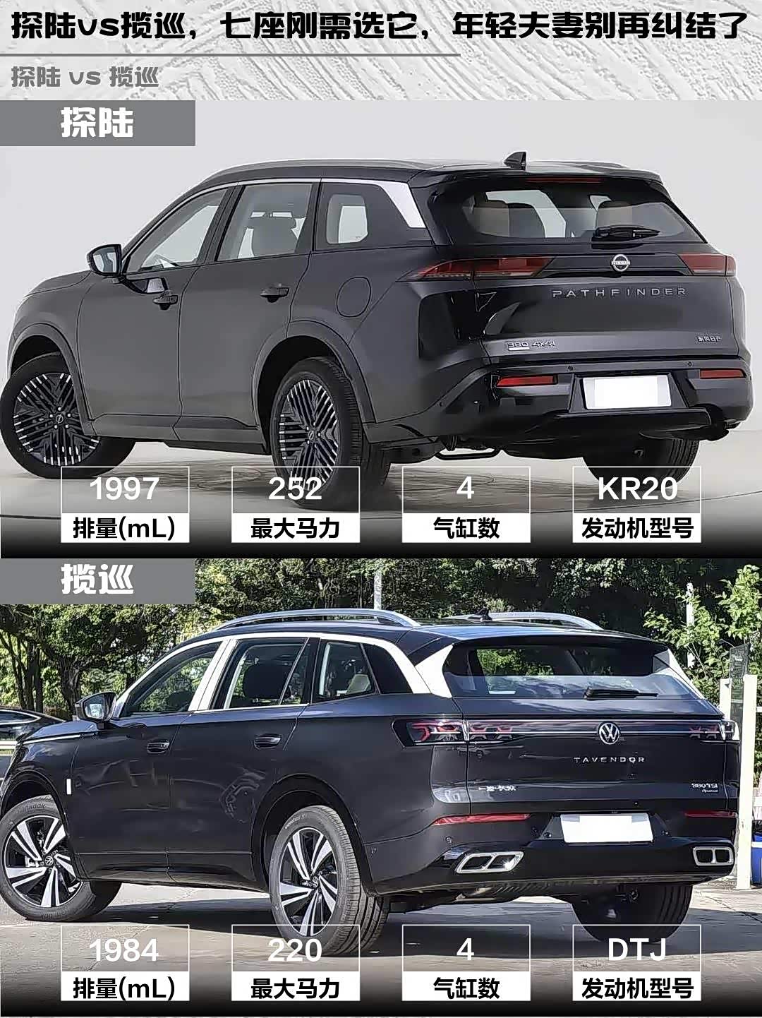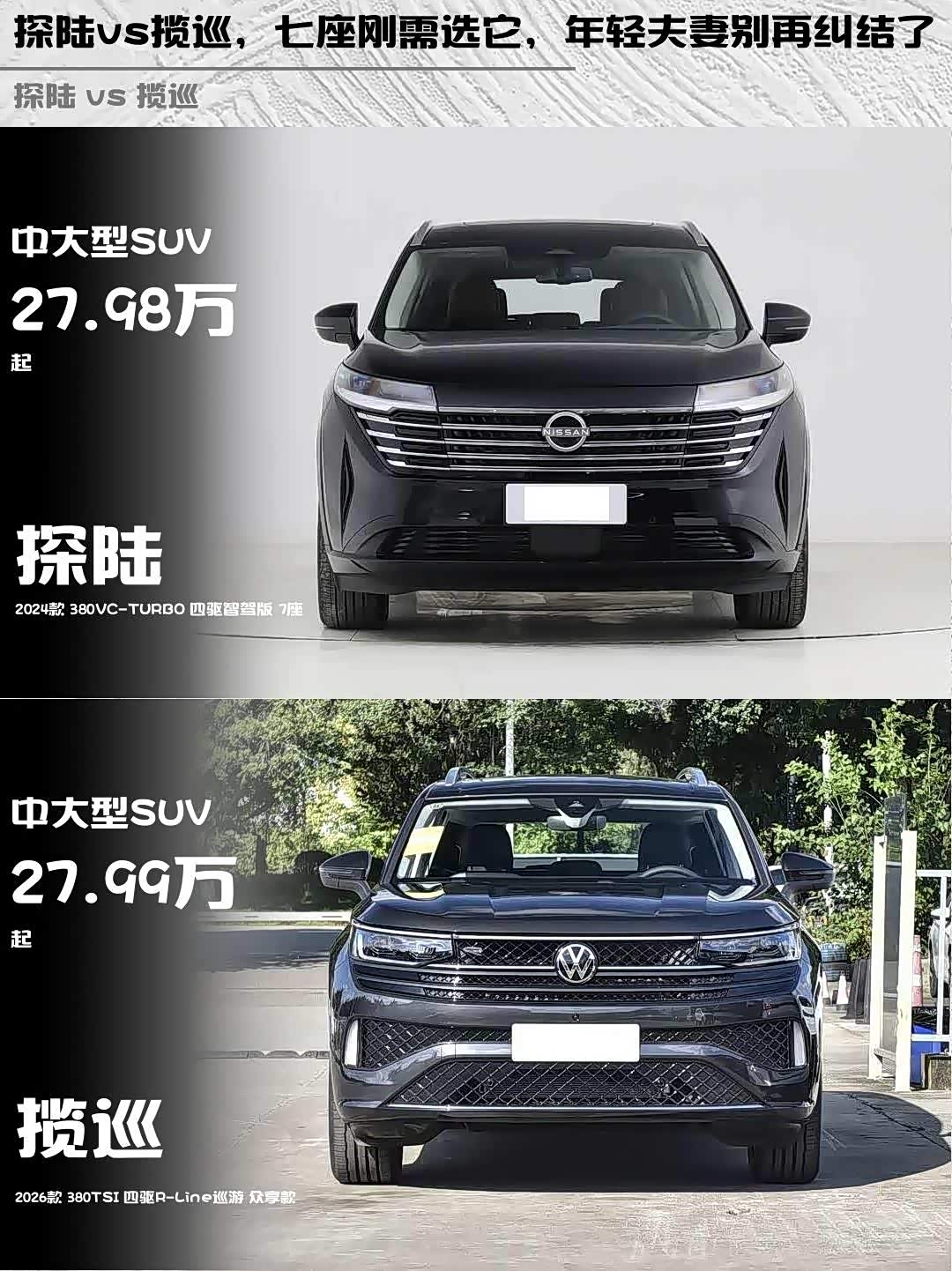 最近在选车的小伙伴看过来!今天给大家深度对比两款热门中大型SUV——日产 探陆(参数|询价)2024款 380VC-TURBO 四驱智驾版 7座和大众揽巡2026款 380TSI 四驱R-Line巡游 众享款,看完这篇你就知道哪款更适合你啦!✨