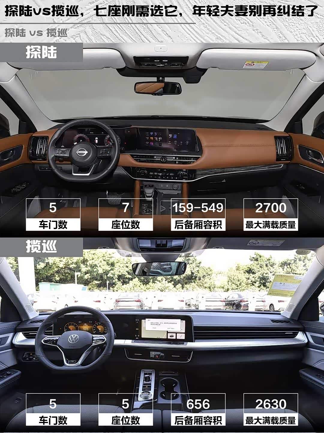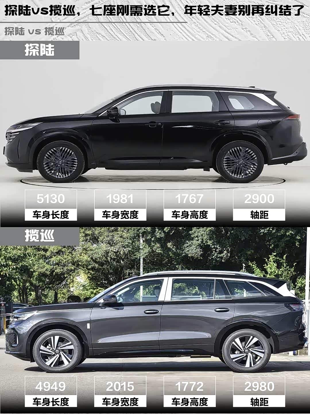 探陆作为7座选手,5130mm的车长比揽巡4949mm更胜一筹,第三排实测170cm成人乘坐无压力,后备箱容积159-549L灵活多变,放倒后直接变2米大床!揽巡则是大五座设计,656L后备箱确实能装,但缺少7座灵活性。家里有二胎或经常多人出行的,探陆更实用哦~