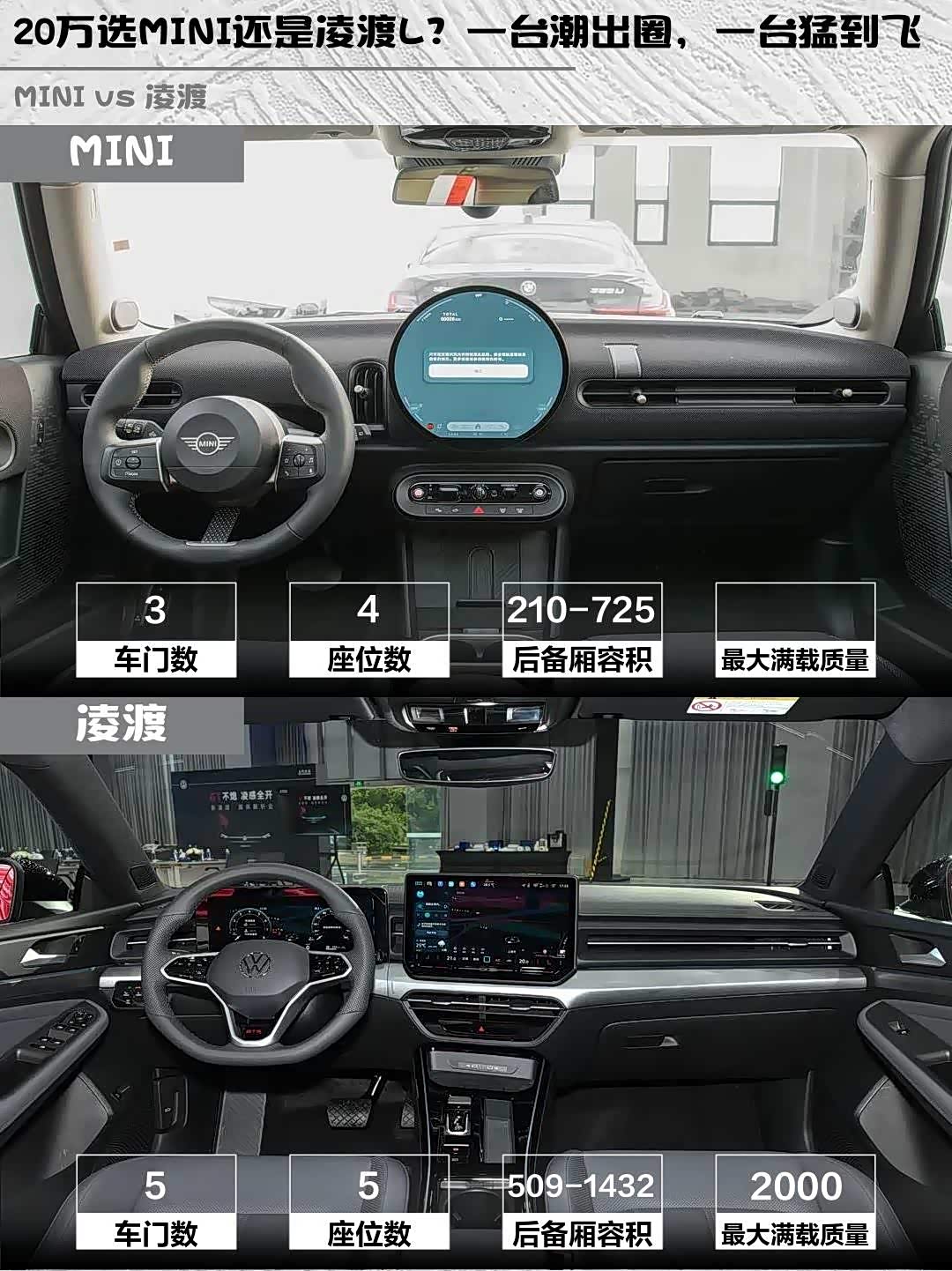 MINI后备箱210L放登机箱都费劲,但后排魔术座椅放倒后能塞下冲浪板!凌渡L的509L掀背尾门开口巨大,搬家时我塞进过一辆自行车🚴 不过MINI前排头部空间反而更充裕,身高180+开凌渡L要调低座椅才不顶头