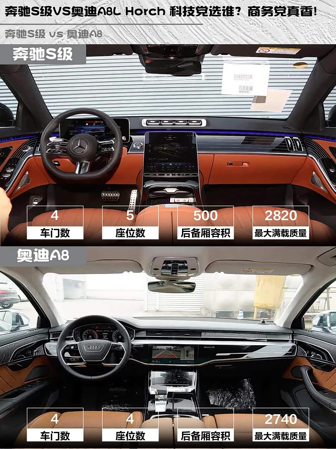 奥迪A8L Horch版车长5450mm,比奔驰S级长了13公分!后排跷二郎腿还能再躺个人,但奔驰的500L后备箱更实用。重点来了:奥迪是4座布局,商务接待逼格拉满;奔驰5座设计更适合家用,中间地台凸起能当茶几用😂