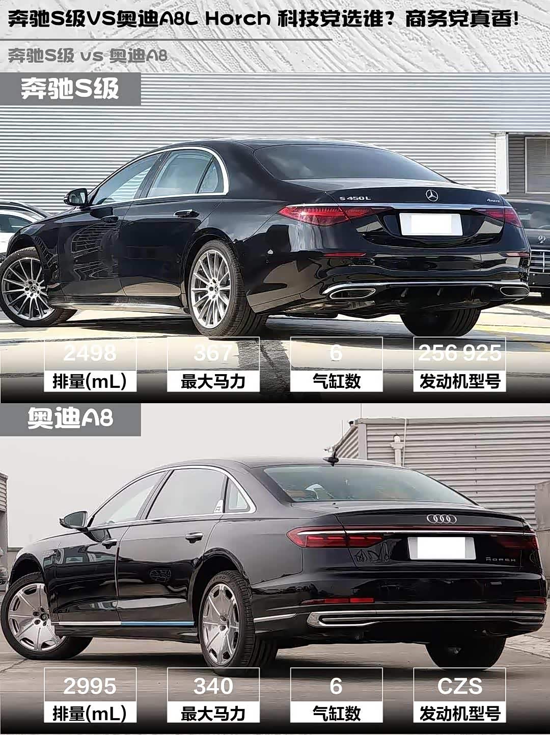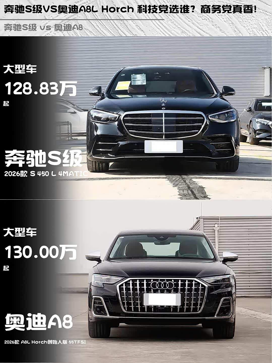 车家号·0浏览·2026-02-28 08:34 · 北京奔驰S级(参数|询价)2026款S 450 L 4MATIC和奥迪A8 2026款A8L Horch创始人版55TFSI,这两台百万级行政座驾到底怎么选?作为深度体验过两台车的“老司机”,掏心窝子分享真实感受!🚗💨