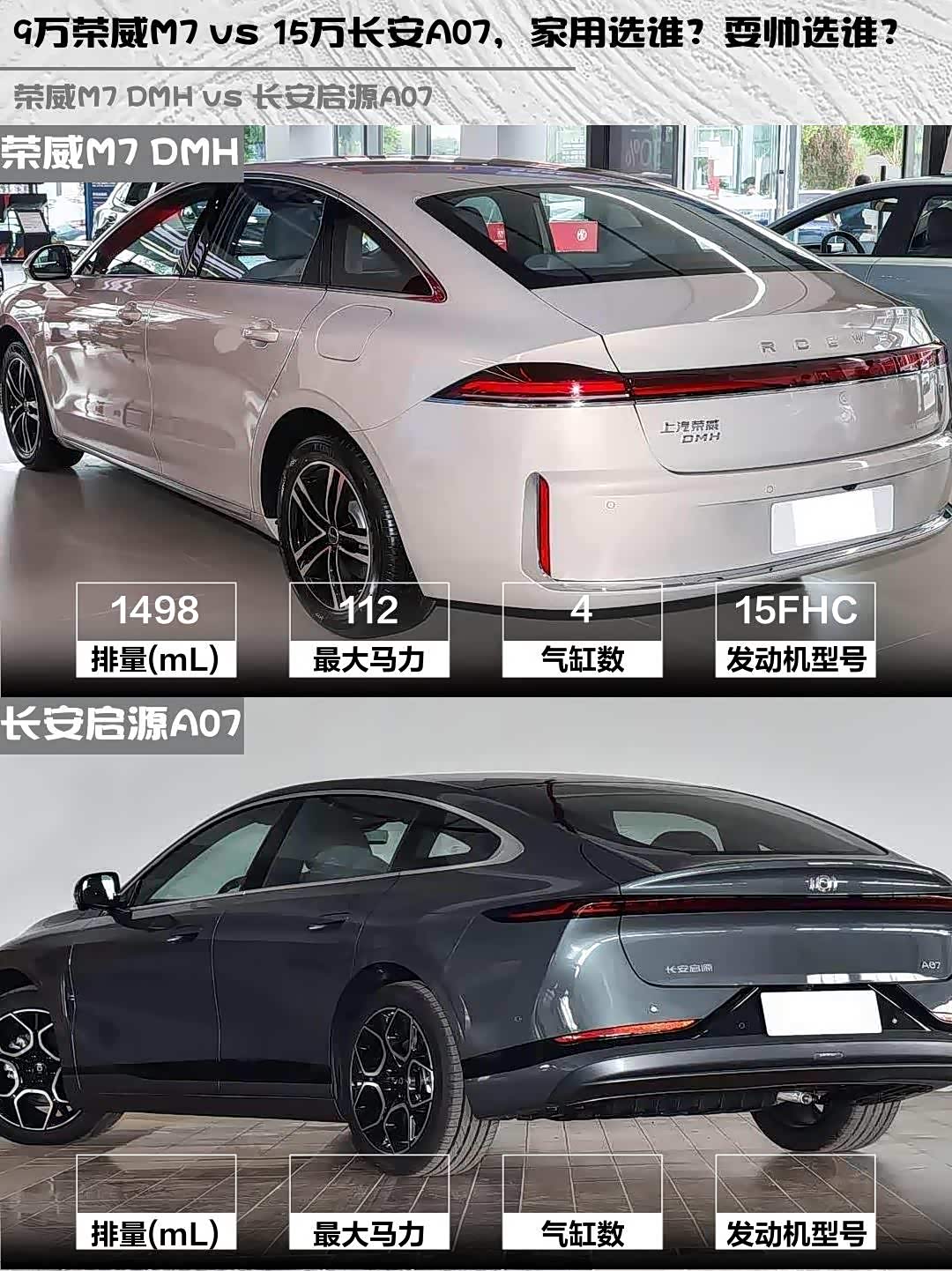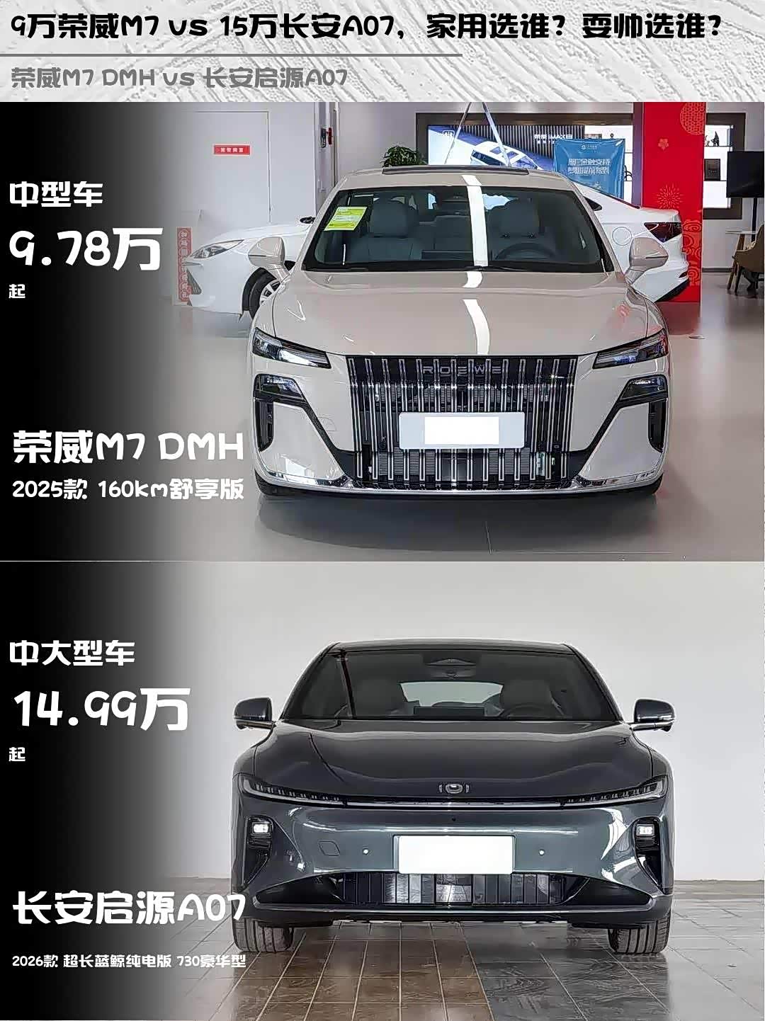 荣威M7 DMH舒享版只要9.78万,插混动力特别适合日常通勤+偶尔长途,性价比超高;长安启源A07豪华型14.99万,纯电大电池更适合追求长续航的朋友。两款都是中型/中大型车,但价格差了5万多,预算有限的话荣威更亲民~💰