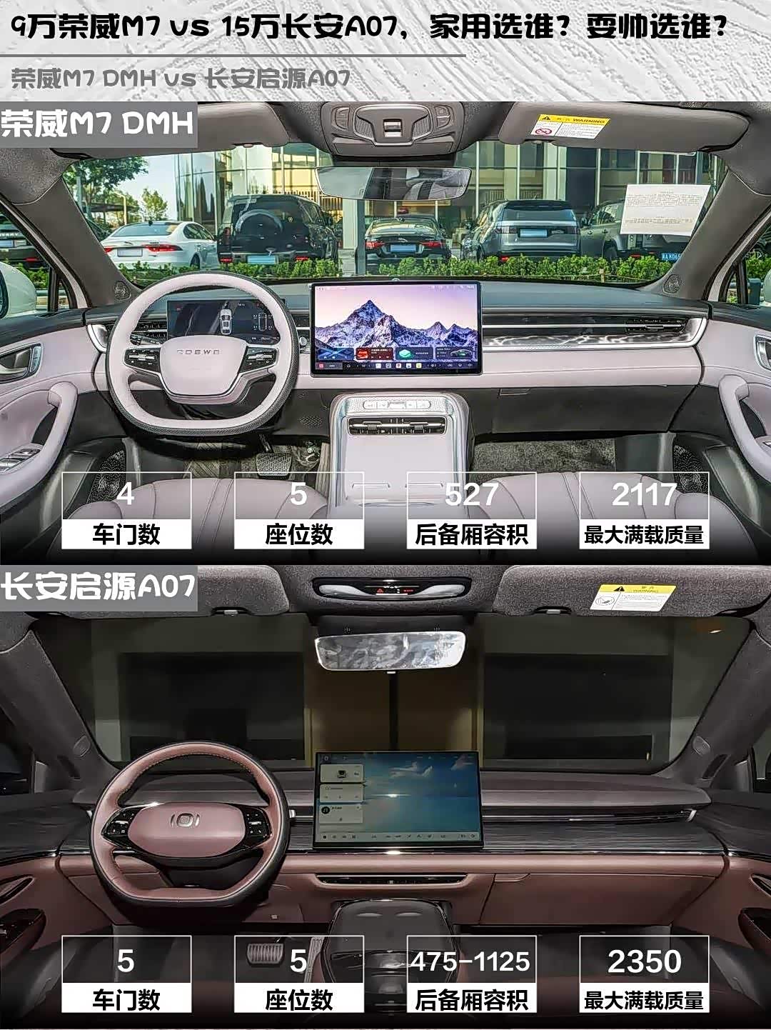 个人觉得,9万多的荣威M7 DMH真是家用神车,省油又实用;而长安启源A07更适合追求科技感的玩家,无框车门+后驱驾驶乐趣十足。你们会选哪款呢?