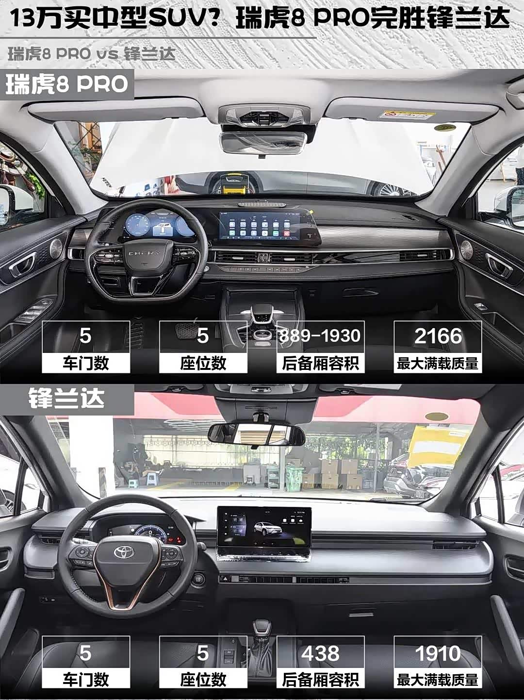 12.3英寸双联屏 vs 10.25英寸中控屏,瑞虎8 PRO的360°全景影像对新手更友好。两台车都带L2辅助驾驶,但瑞虎8 PRO多了电动后备厢和可开启全景天窗。锋兰达的优势在于丰田口碑加持,后期保养更省心。