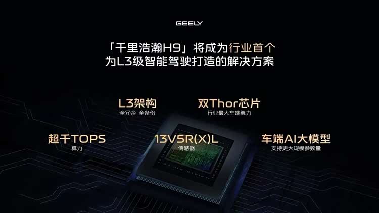 以其高端方案千里浩瀚H9为例,这套被外界称为“安全标杆”的配置,绝非单纯的参数炫技,而是围绕“全场景可信”构建的冗余体系:双Thor芯片加持,带来1400TOPS的顶级算力,为复杂场景下的快速决策提供充足支撑;5颗激光雷达协同工作,实现3重360°全维覆盖,让车辆拥有无死角的环境感知能力。