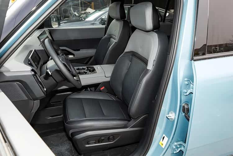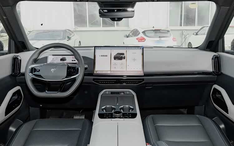 座舱内部,与福特烈马截然不同,采用了国内新能源车常见的简约风格,当然在空间与功能上还是很有看点。双色仪表台顶部有很好的环绕效果,出风口造型与台面也很协调。数字交互上,提供15.6英寸2.5K中控大屏、8.8英寸全液晶仪表屏,还有70英寸的超大HUD抬头显示和流媒体内后视镜。提供怀挡式电子档位,扶手台全部用来储物,双手机位带50W无线充,双杯架,还保留了实体控制旋钮,后方对开式扶手箱,高配车新内部是车载冰箱。
