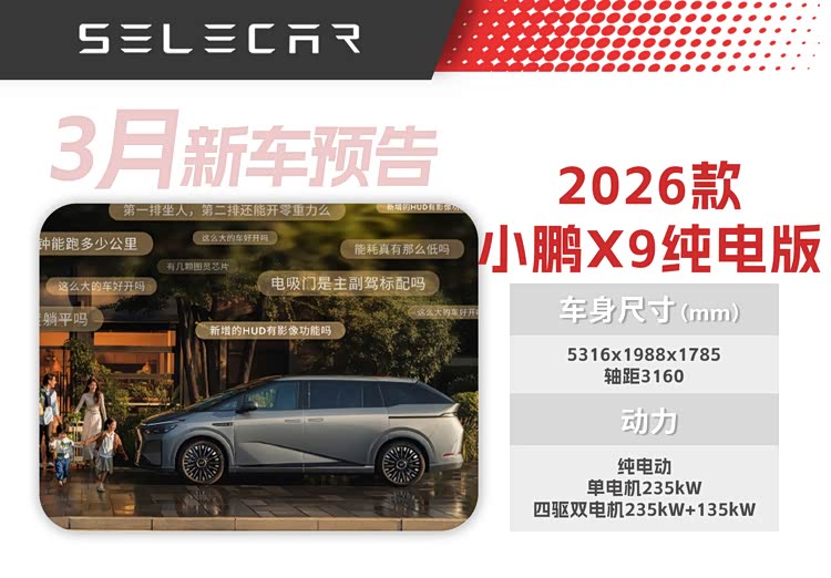 2026款小鹏X9纯电版MPV将于3月2日正式上市,共有5款车型。全系标配800V高压平台+5C超充AI电池,最高CLTC纯电续航提升至750km,新车宣称是“全球续航最长的纯电大七座”,目前已经开启预订。
