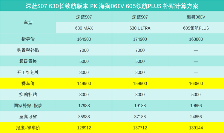 深蓝S07和海狮06 EV都提供长续航版本,深蓝S07的纯电续航是630km,海狮06 EV是605km。其中,深蓝S07 630 MAX的指导价是16.49万,但各项政策算下来,叠加报废补贴后,裸车价就只有12.8万元左右,至高优惠超过3.5万元,价格非常合算。海狮06 EV就没有购置税补贴了,裸车价还是16.38万,整体的优惠至高只有约2.4万,整体算下来价格要比深蓝S07贵了1万多,基本就是一台iPhone17 Pro中档版本的价格了,放在两台纯电动车上,1万元左右的差价,基本就差出了2-3年的电费,这样一看,差距还是蛮大的。