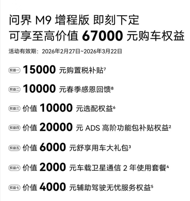 值此春日出行季,问界M9更推出限时购车重磅礼遇。即日起至3月22日,下定问界M9至高可享87000元购车权益,涵盖购置税补贴、春季感恩回馈及ADS高阶功能包补贴等多重福利,以真金白银的优惠,让触手可及的科技豪华,陪伴每一位用户奔赴春日山海,解锁更多出行美好。